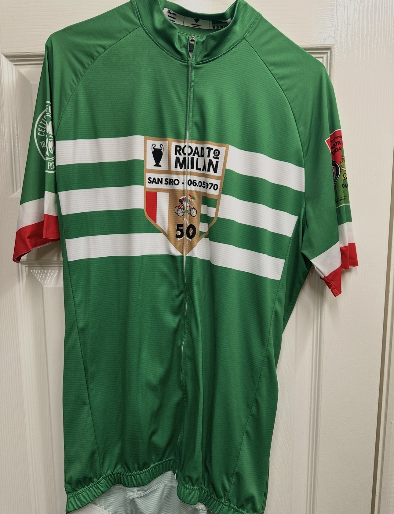 The montage below is now completed, set against the pleasing backdrop of the short- and long‑sleeve Road to Milan cycling kits, originally designed for the 2020 ride to commemorate the 50th Anniversary of the Final.