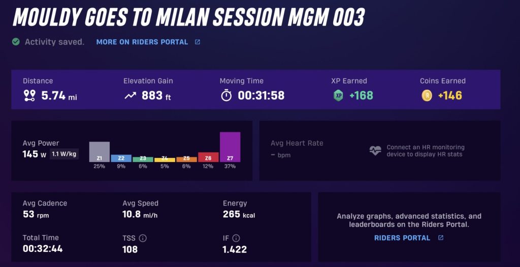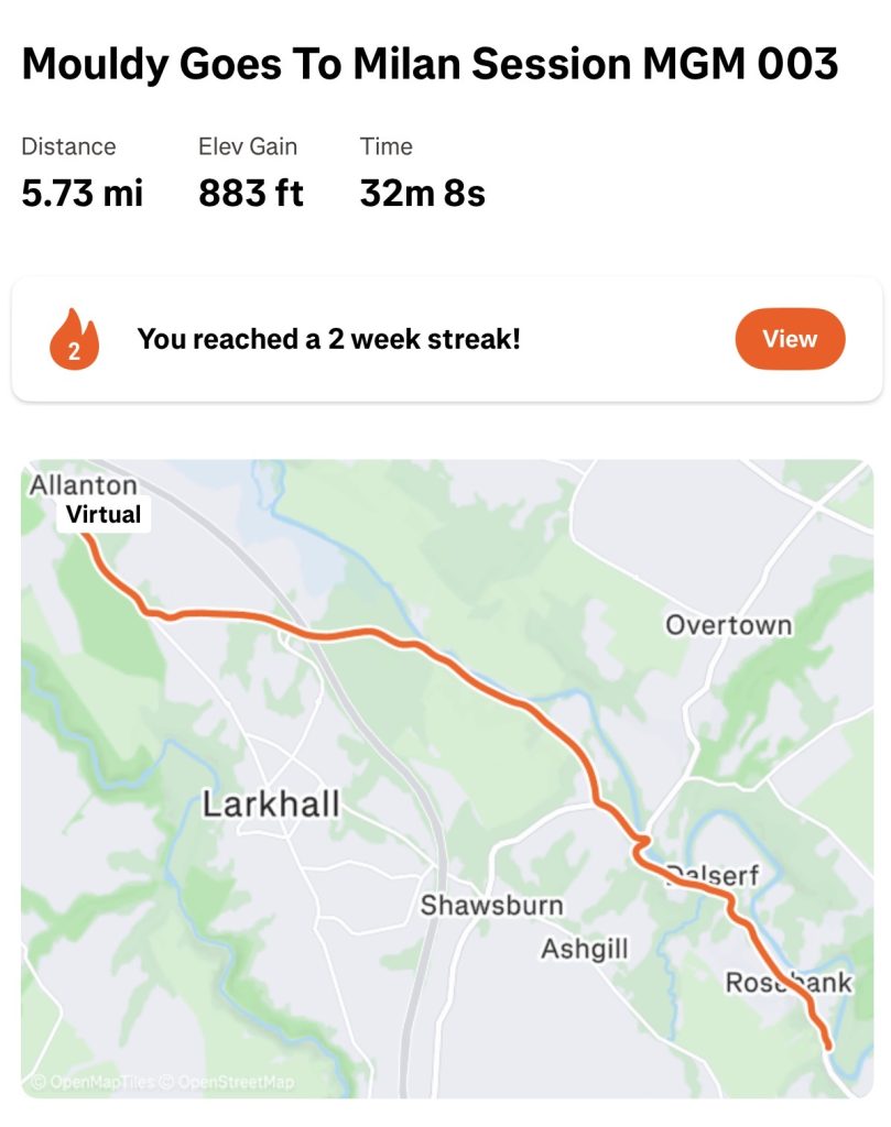 The above sessions, miles, feet climbed and minutes relate to the “actual” progress being made by Mouldy as he goes to Milan this is done by replicating and following the GPX route