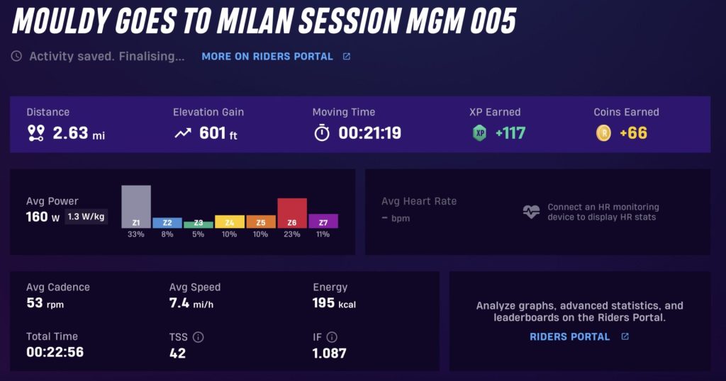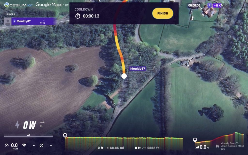 The above sessions, miles, feet climbed and minutes relate to the “actual” progress being made by Mouldy as he goes to Milan this is done by replicating and following the GPX route
