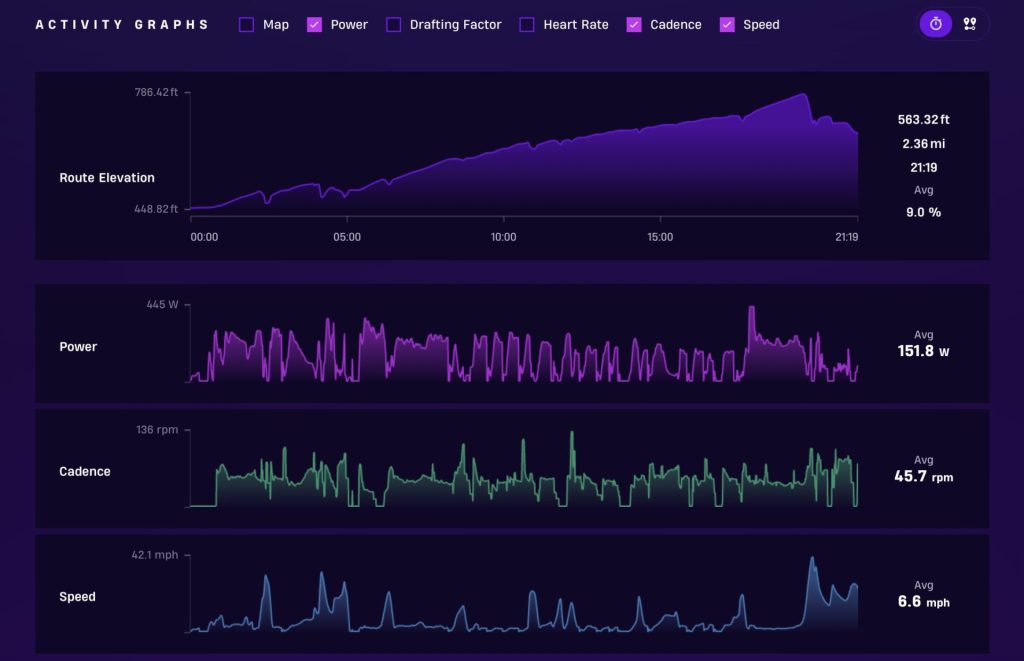 The session clocked in at 2.62 miles with 600 feet of climbing, with the direction of travel very much heading south‑east, there had been some tasty plus 20 % climbs with average at 9 %