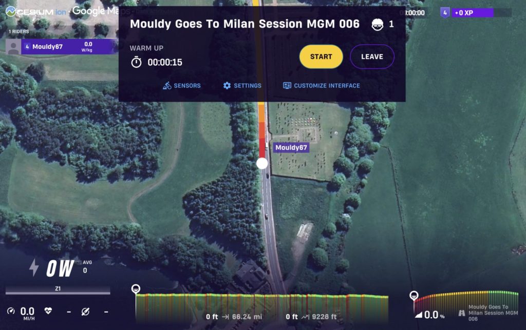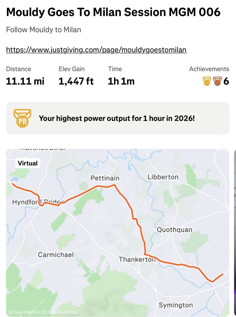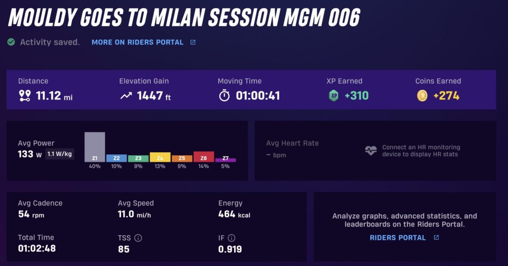 The above sessions, miles, feet climbed and minutes relate to the “actual” progress being made by Mouldy as he goes to Milan this is done by replicating and following the GPX route